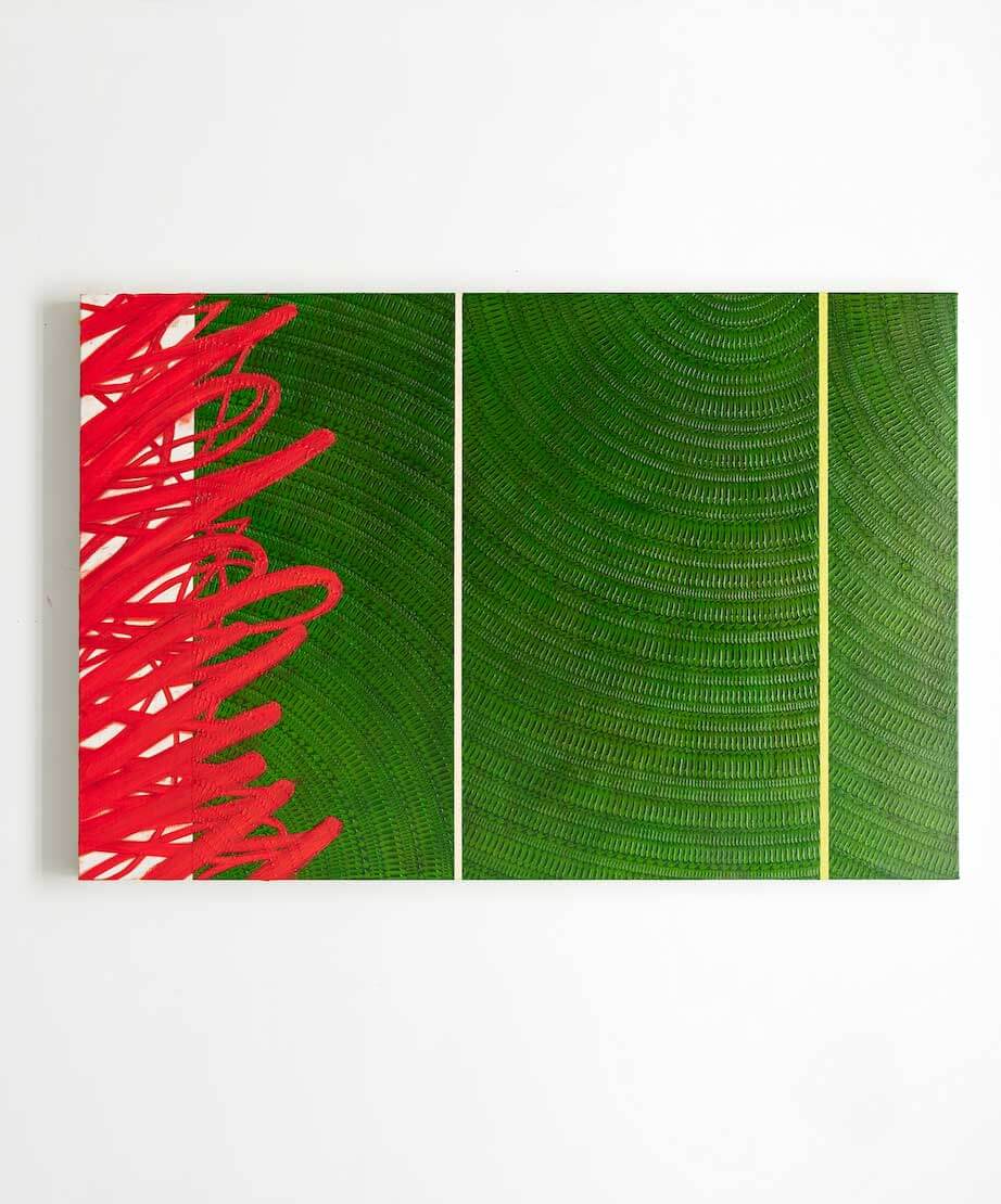 小泉遼は福島県を拠点に活動し、禅、円相、後光のような東洋的な思想を⻄洋的な要素である油彩で表現し、東洋的美学と現代的表現が調和した独特な魅力を披露する作家である。意識と無意識の狭間で生まれる模様や色彩の積み重ねを通じて、絵画が自己を投影する「窓」となることを探求している。2019年より制作を続ける「enso」シリーズは、禅の書に見られる円相や曼荼羅、枯山水の砂紋など、東洋的な思想を基盤としている。「Halo」シリーズでは、⻄洋絵画の伝統的な技法であるグレージングを駆使し、透明度の高い油絵具を何層にも重ねことで、奥行きのある色彩を生み出した。それにより、図と地の境界が曖昧になり、反復される模様の一つ一つに微妙な差異が生まれ、そこに人の存在の痕跡すらも表現しようとする。「私は何度も絵具を積み上げます。規則性と偶発性、色彩の要素を通じて光を絵画に閉じ込めます」と語る小泉は、規則的な反復と偶然性の中で光の神秘的な動きを描き出し、観客に無限の秩序と驚異を感じさせる。